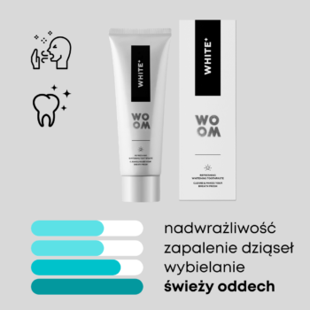WOOM TOTAL+ zawiera składniki, które pomagają zmniejszyć tworzenie się płytki nazębnej, wzmacniają zęby i dziąsła, zapewniają trwały świeży oddech. Chroni przed ubytkami.